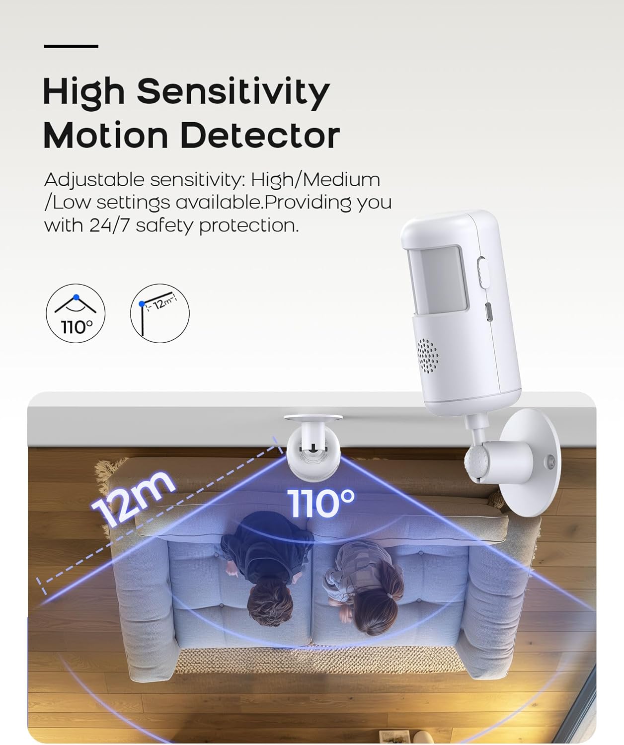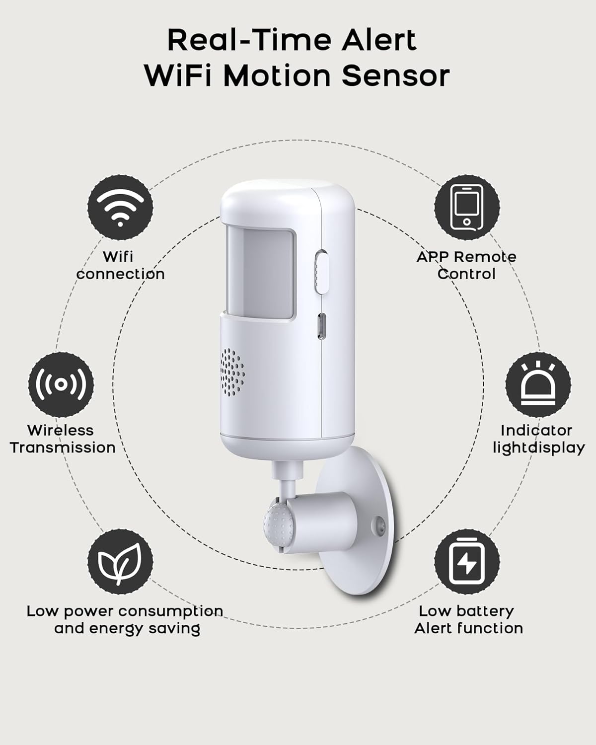 【WiFi Connection & APP Control】No need to connect to a host. The sensor directly connects to WiFi and instantly sends an alert to your phone when it detects someone, while also triggering an alarm sound.