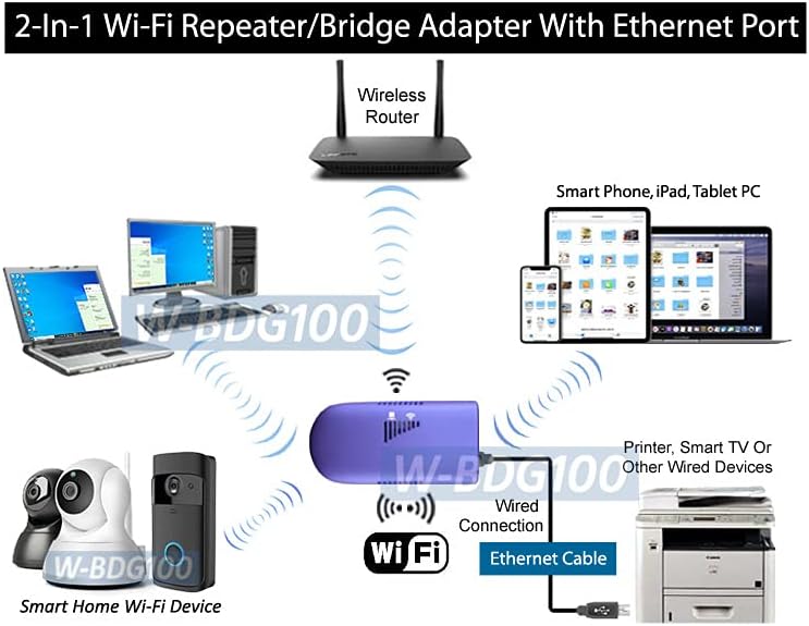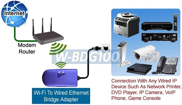 Hybrid Wi-Fi bridge adapter + Wi-Fi repeater for all wired home A/V equipments, security surveillance gears, computer peripherals and networking devices. Universal compatibility. Works with any device built with an Ethernet port. Wirelessly connect any home A/V device such as smart TV, blu-ray player, game console with Ethernet port to the Internet. Great Wi-Fi bridge adapter for surveillance gears and computer peripherals such as IP camera, CCTV DVR, computer, printer, network switch etc
