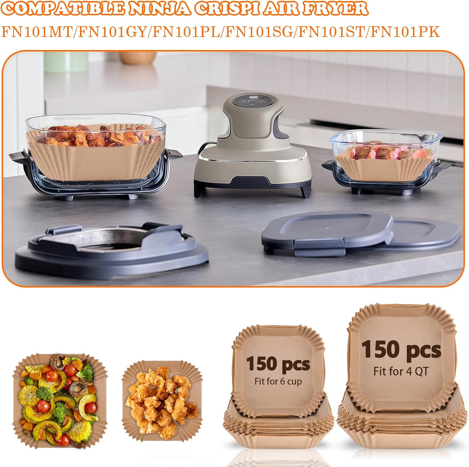 DESIGNED for NINJA CRISPI AIR FRYER: Compatible with ninja crispi 4-in-1 portable glass air fryer FN101MT/FN101GY/FN101PL/FN101SG/FN101ST/FN101PK. 150PCS Large for 4 QT & 150PCS Small for 6 Cup Glass Containers. Appropriate size of the parchment paper makes our cooking cleaner and safer