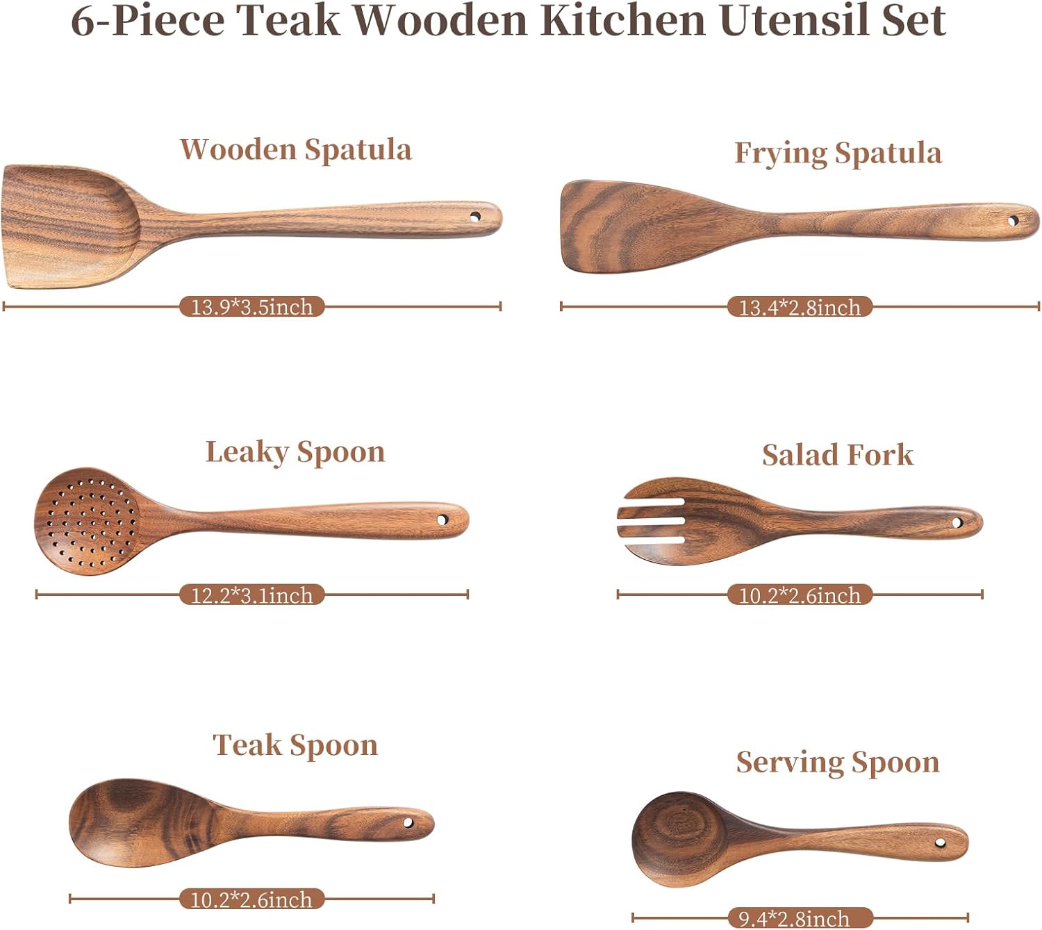 6-Piece Wooden Spoon set: Wooden Cooking Utensils includes wok spatula, frying spatula, salad fork, filter spoon, wooden spoon, serving Spoon, meeting various needs during your cooking process and making it easy to cook delicious dishes