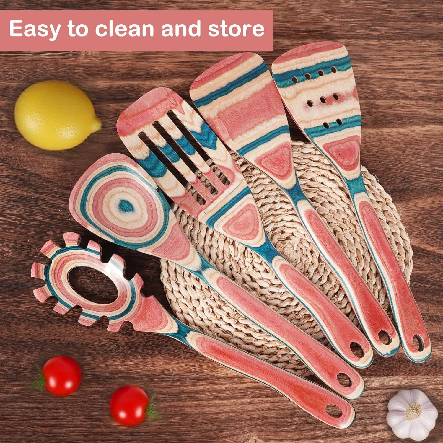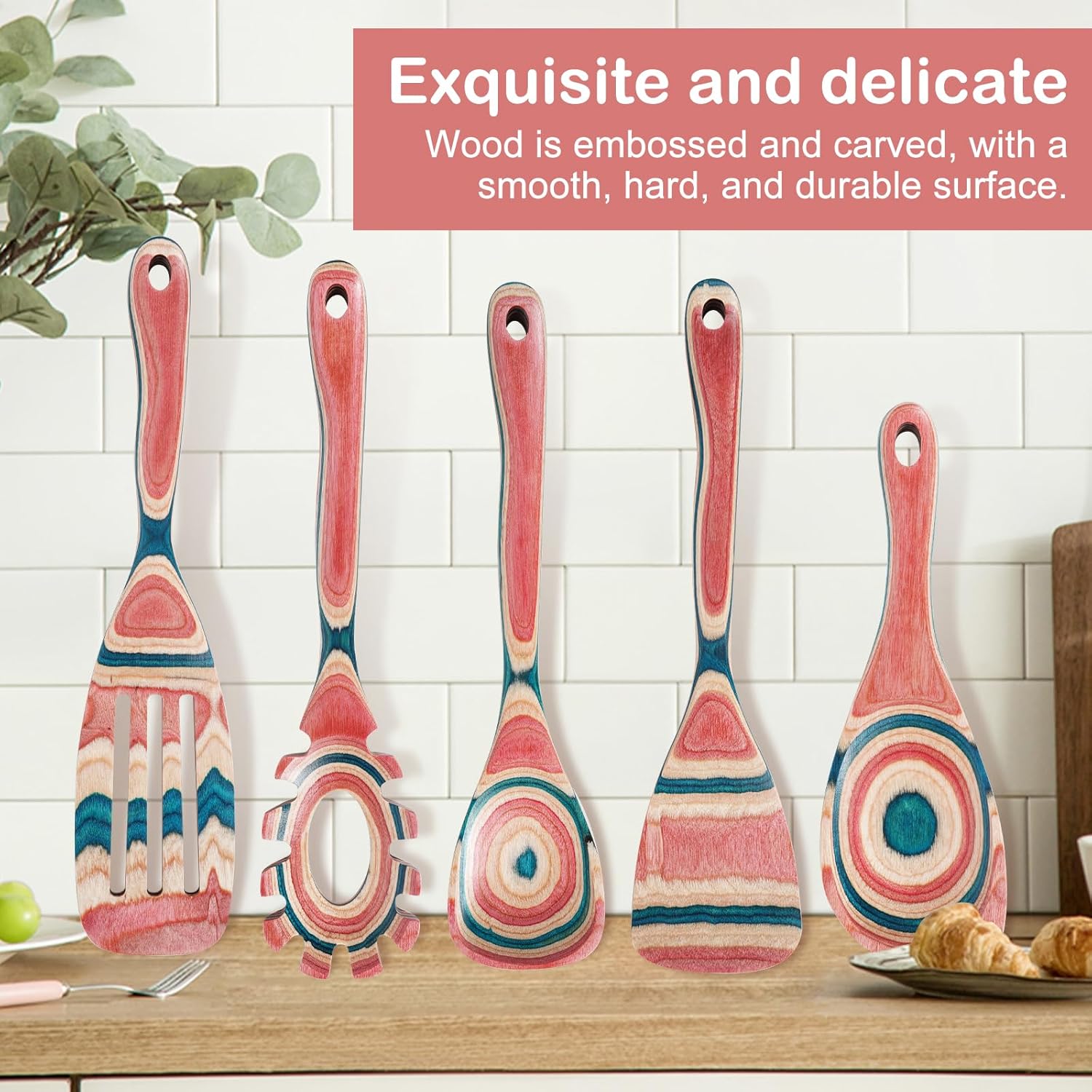 Customers find the wooden spoons beautiful and of great quality. The color accuracy receives mixed feedback, with one customer noting that the utensils lose color if machine washed. Durability is also mixed, with some customers finding them durable while others report issues with chipping at the ends.