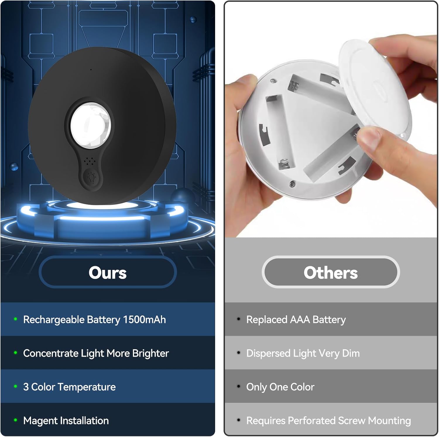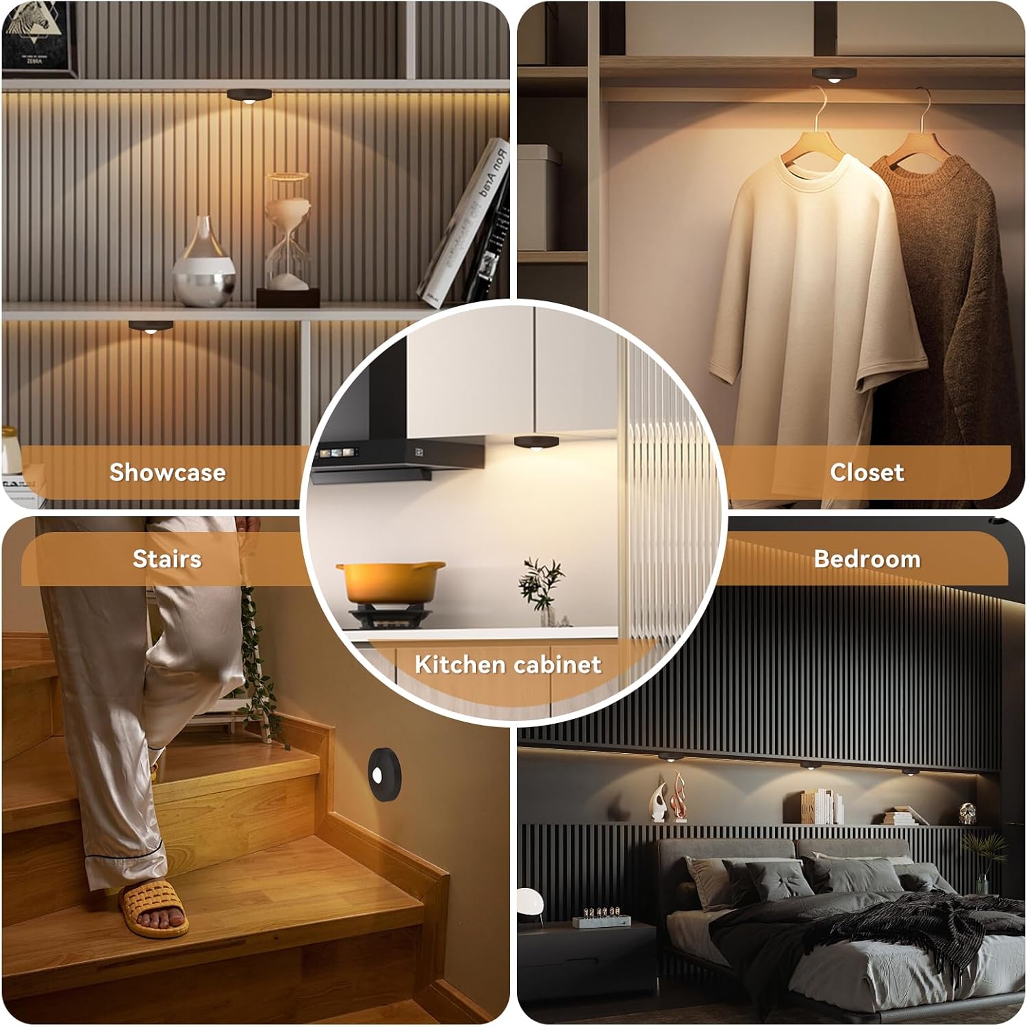 【Versatile & Portable】Ideal for kitchens, cabinets, closets, stairs, and more. Compact and lightweight, these puck lights are perfect for both decorative lighting and emergency use.