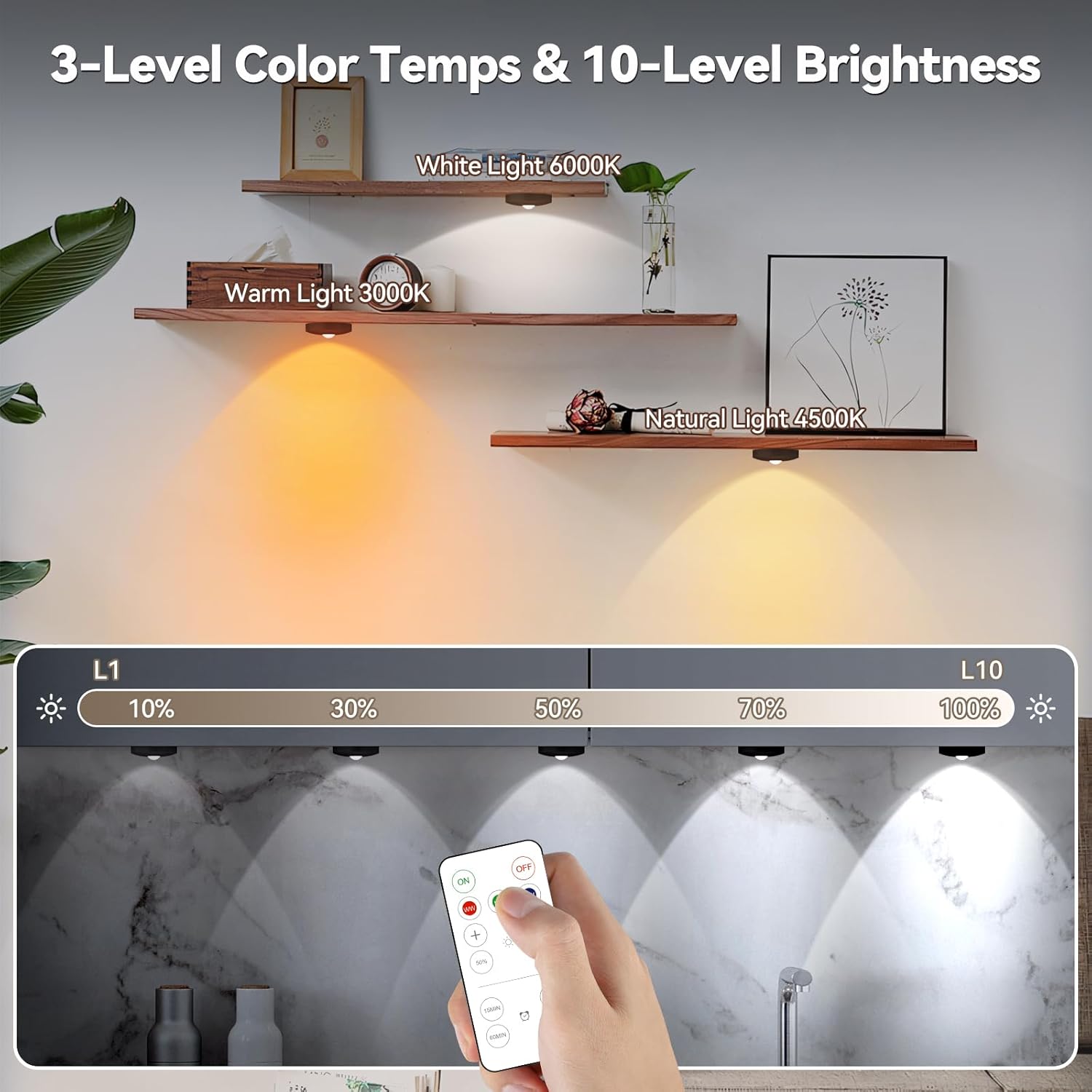 【Customizable Lighting】3 color temps (3000K Warm, 4500K Neutral, 6000K Cool) & 10 brightness levels. Featuring 3 light modes (constant/flash/smooth), these puck lights are perfect for task lighting, mood enhancement, or adding vibrant ambiance to any space.
