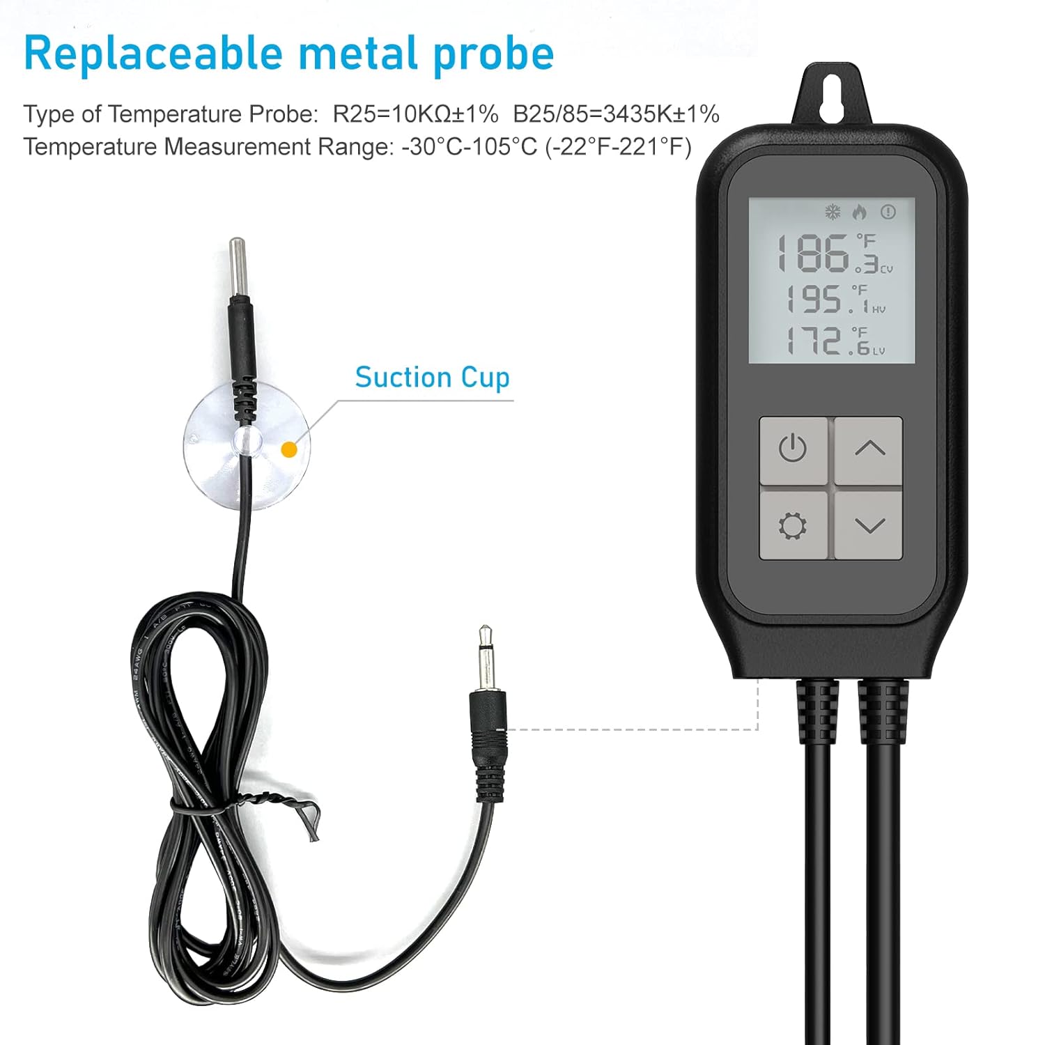 Easy & Accuracy & Powerful: Plug and play. Supports °C/°F display. 1200W/10A Max for each outlet. -22~221℉/-30~105℃ temperature range with 0.1°C accuracy. Replaceable metal probe. Setting memory function
