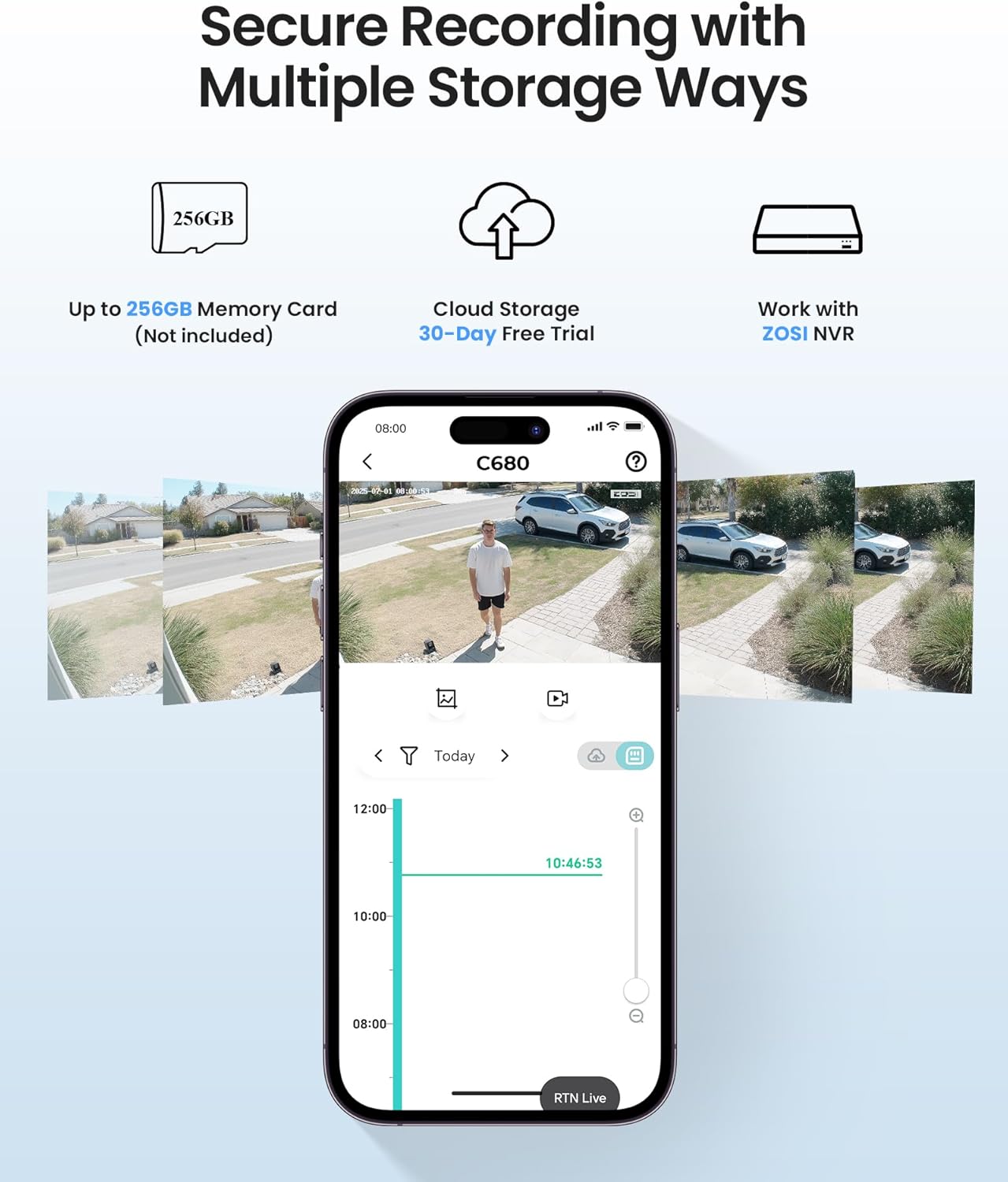 (5). [ Flexible Recording & Storage Options ] __ Supports memory card storage (up to 256GB, not included), secure cloud storage, and seamless compatibility with ZOSI NVR systems. Whether you prefer local backup or remote access, your footage is always safe and accessible.