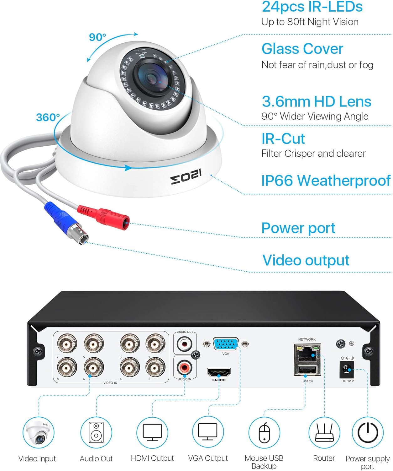 (2). [ 3K 5MP Lite System Overview ] __ The system includes an 8-channel 5MP-Lite DVR recorder paired with 8 weatherproof 1080p dome cameras, featuring 80ft night vision and a 90° viewing angle. The 60ft BNC+DC CCTV cabling provides both video and power, offering more stability and reliability than wireless systems. A 1TB security-certified hard drive is pre-installed in the DVR.