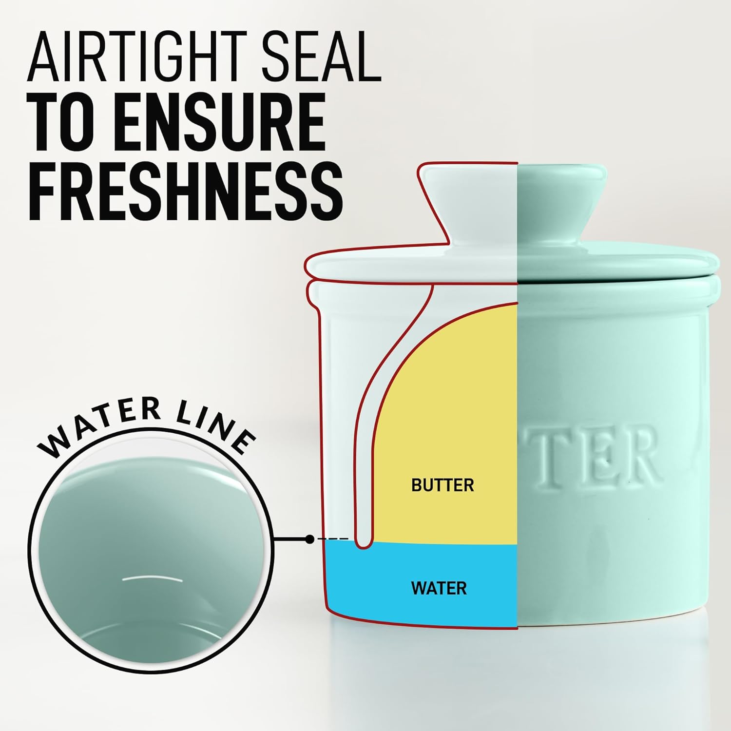 AIRTIGHT FRESHNESS: Our porcelain butter crock keeps your butter fresh by using a water-filled base that creates an airtight seal. The bell of this butter crock comfortably holds a whole stick, ensuring you always have delicious, spreadable butter on hand.